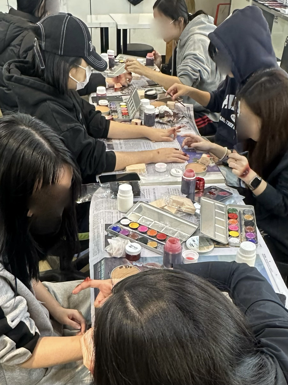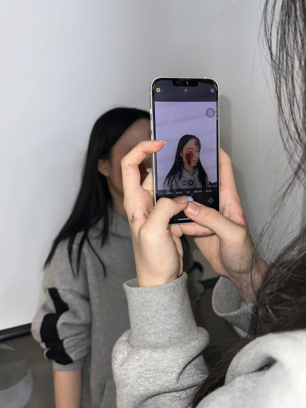분장반 학생들이 너무 잘해서 이번에는 상처분장을 활용하여 상호로 얼굴에 좀비 분장을 해보기로 하였는데요 !!