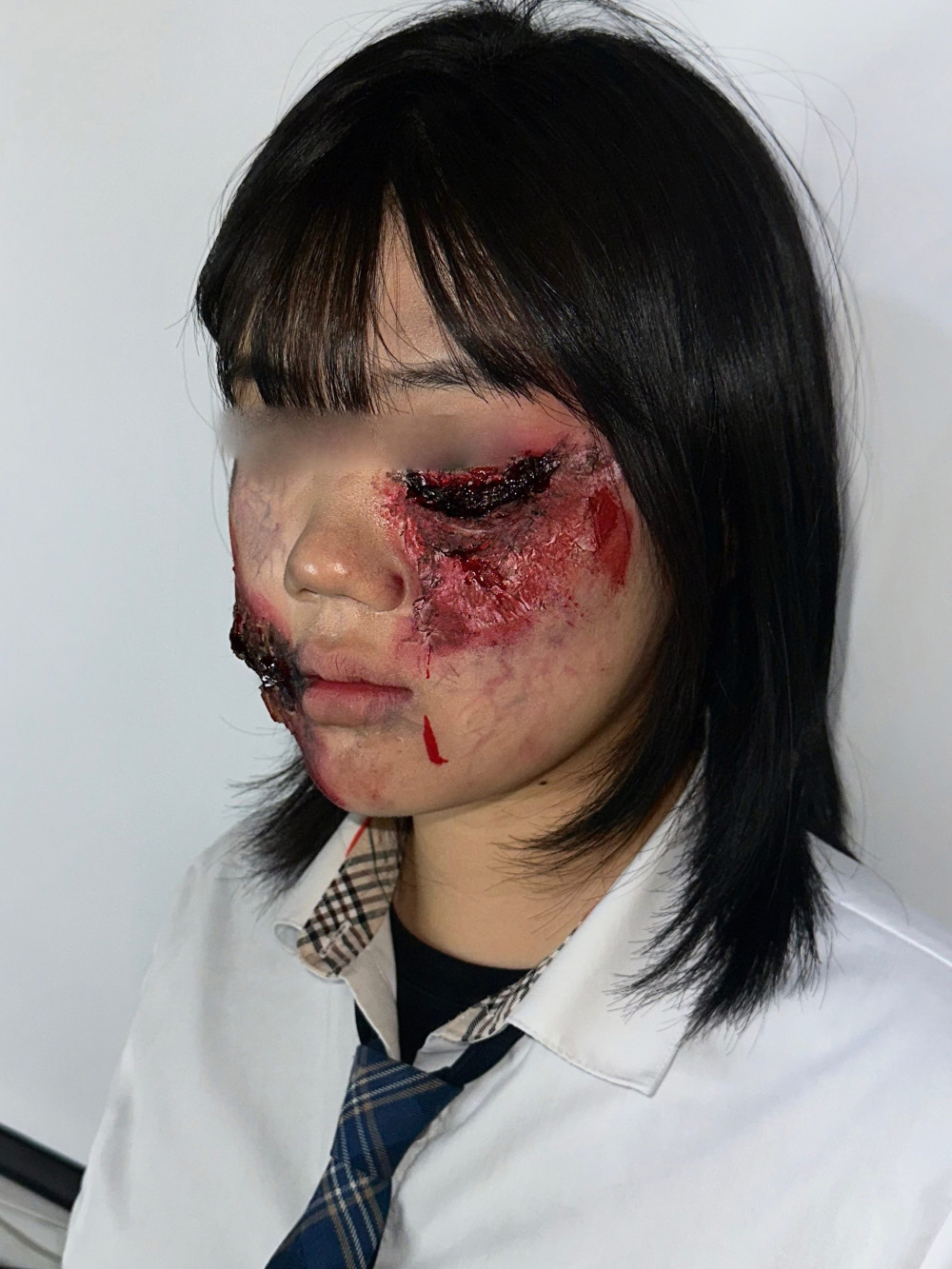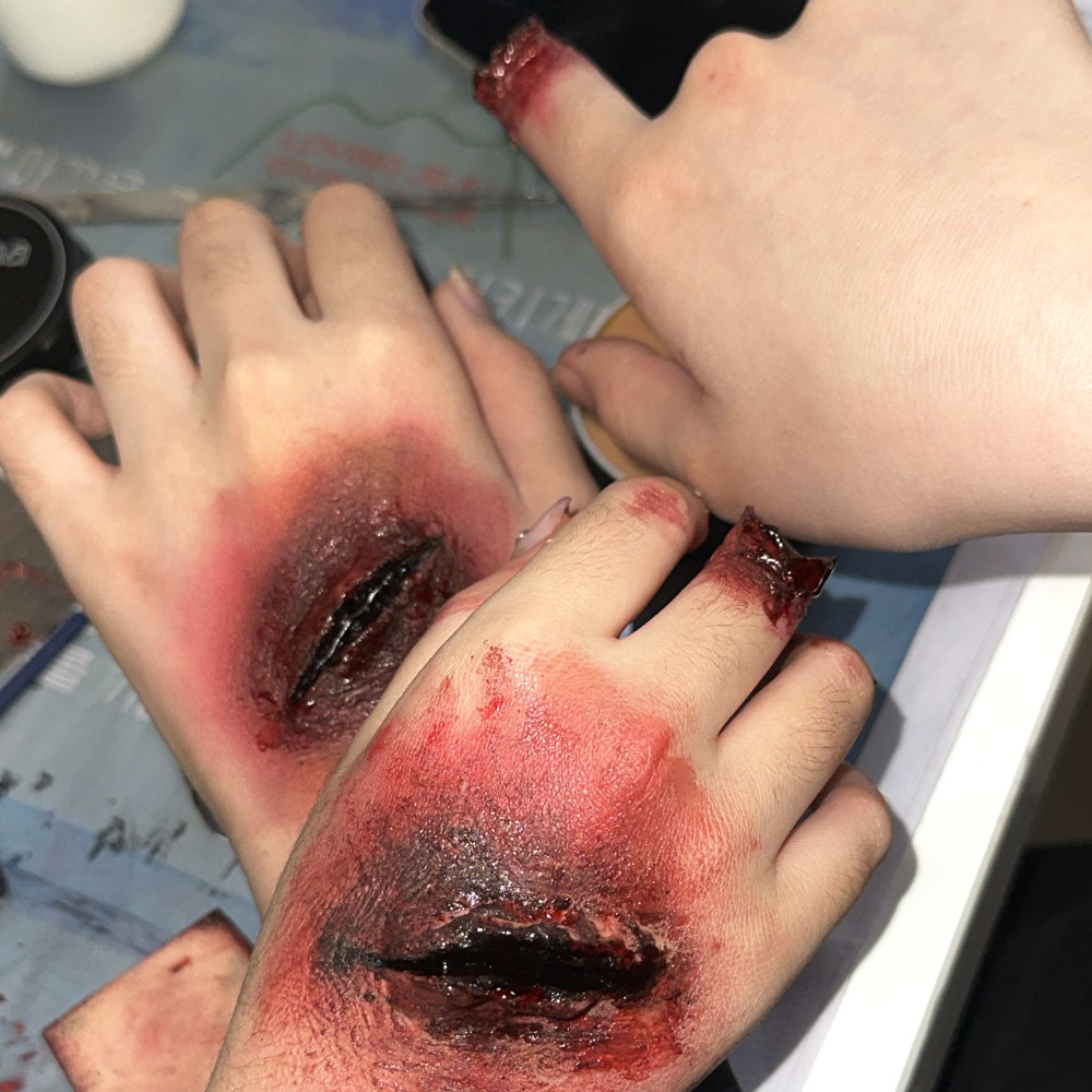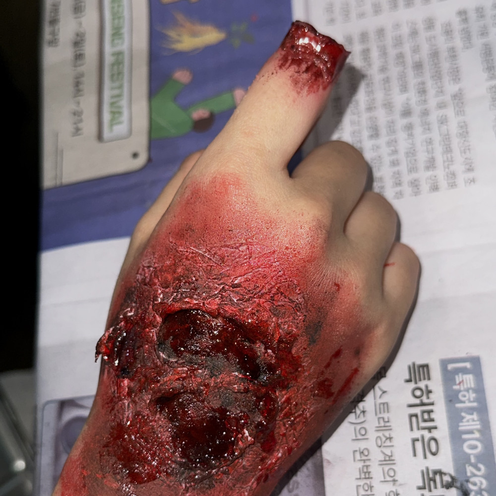 여기에 라이닝과 가짜피로 현실감을 더해주면 완성 ! 손가락에는 더마왁스를 활용해 절단된 느낌까지 표현해주었어요 ~~