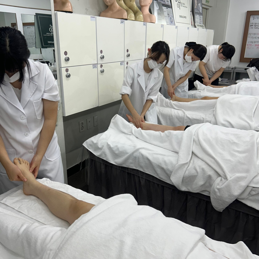 2과제 웨건, 베드, 모델 셋팅 까지 다 완료 하며 팔 관리와 다리 관리 까지 하고있는 수강생들의 모습입니다!