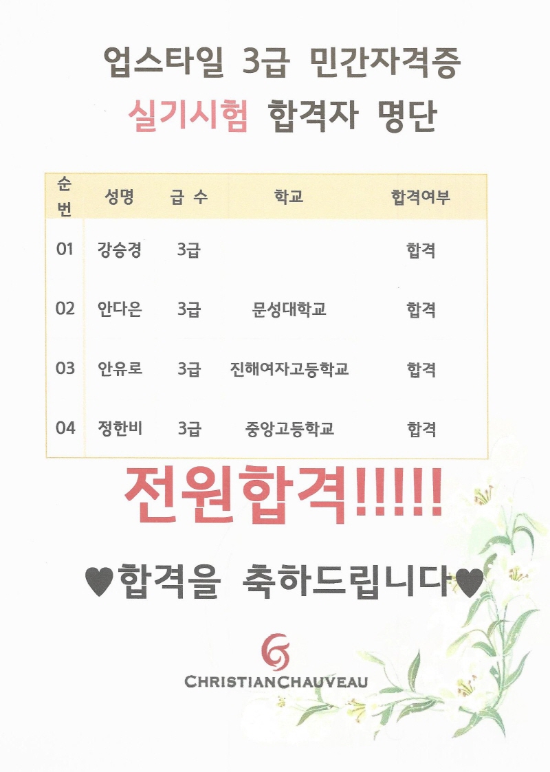 업스타일 3급 민간자격시험 합격자명단 입니다^^*