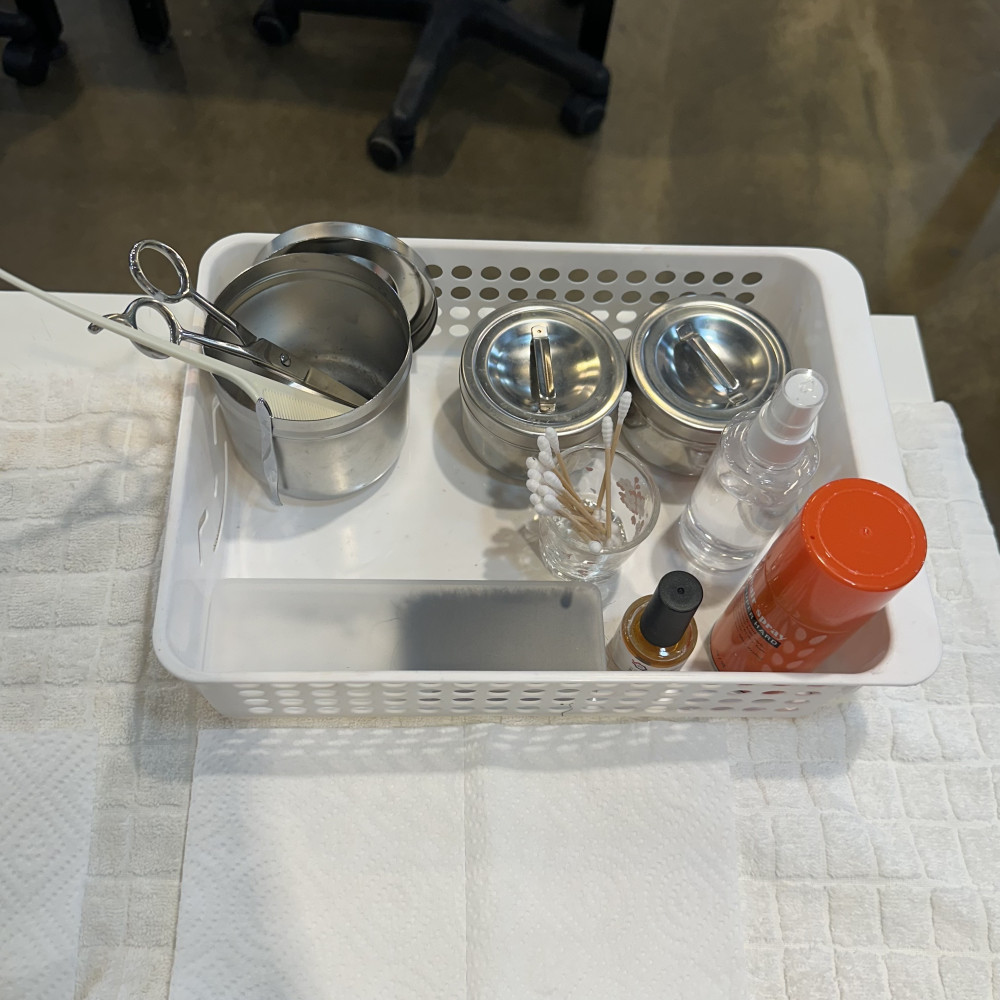 바구니 안에는 큰 소독통(가위, 빗, 핀셋) / 알콜솜통 / 마른솜통/ 소독스프레이 / 면봉 수염 / 스프리트검 / 스프레이 를 준비해주세요