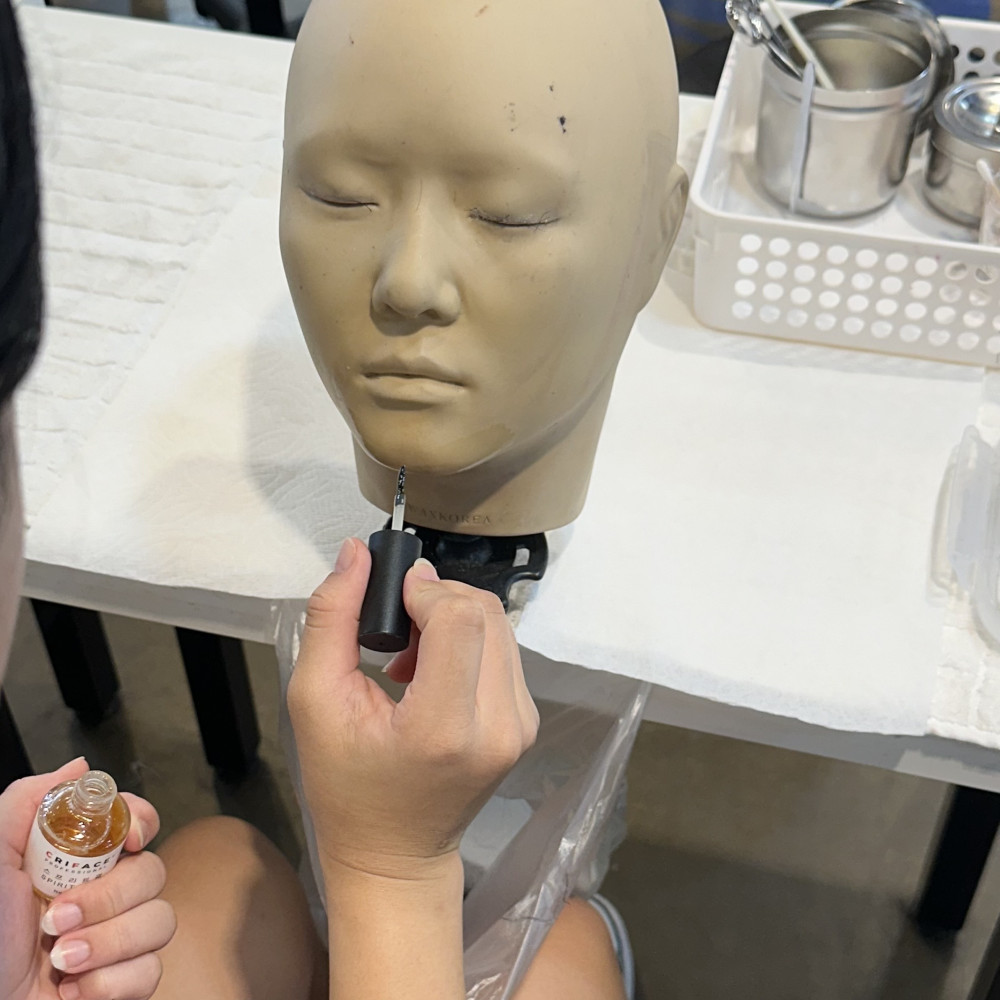과제를 시작하면 먼저 손소독 - 마네킹 작업부위 소독 - 도구 소독을 해준 후 작업할 부위에 스프리트검을 도포해줍니다 !