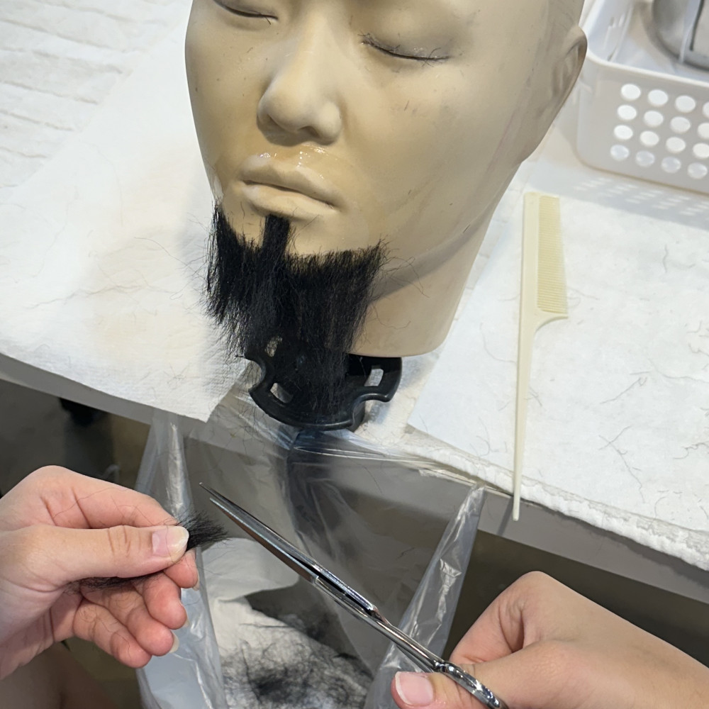 수염을 모두 붙여주었다면 입술을 가리지 않게 콧수염을 잘라주고, 턱수염은 턱 밑 1-2cm 길이로 잘라줍니다