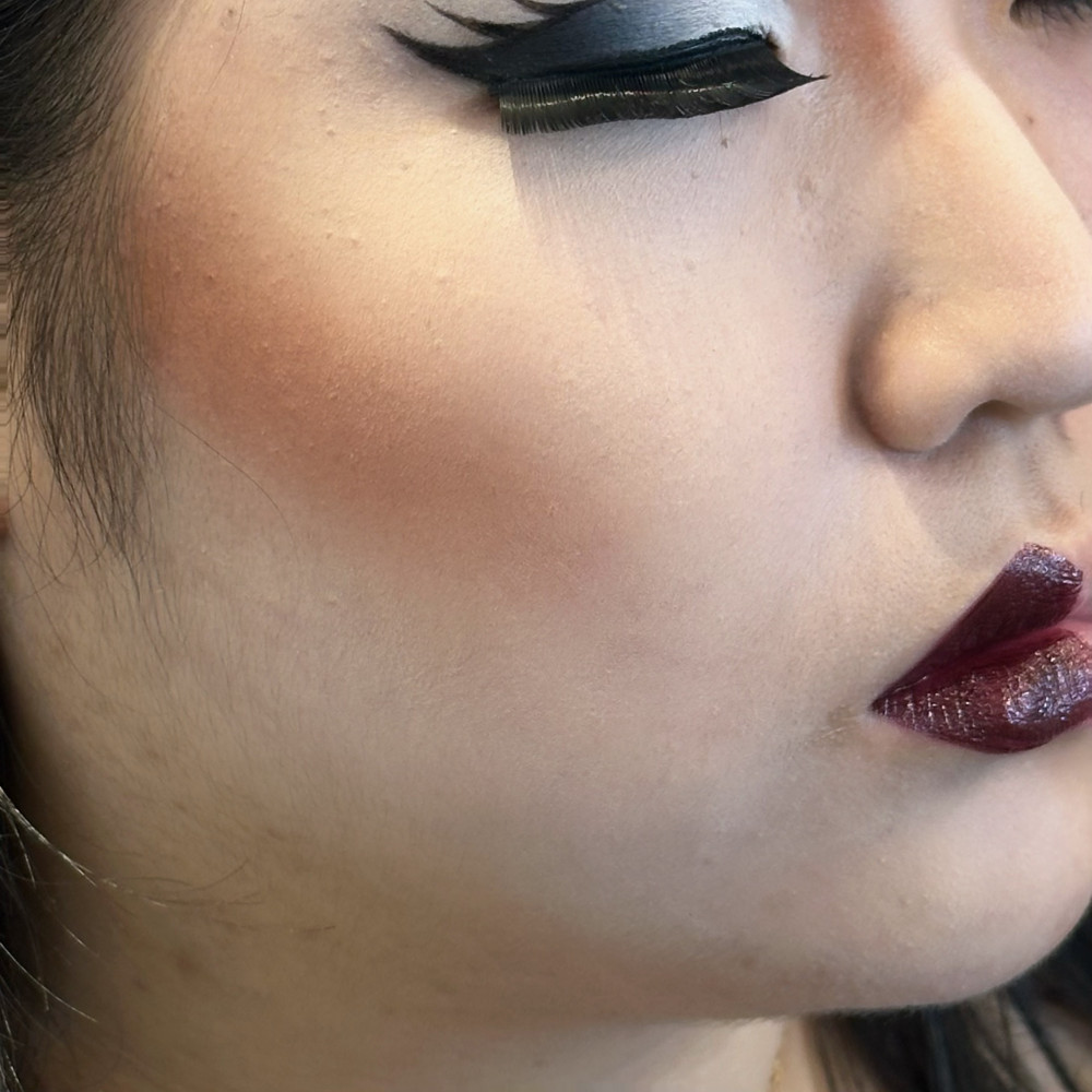 블러셔는 레드브라운 컬러로 사선으로 선명하게 발색해주고, 립은 마름모형태로 입술산을 각지게 표현하여 검붉은색을 발라주세요 !