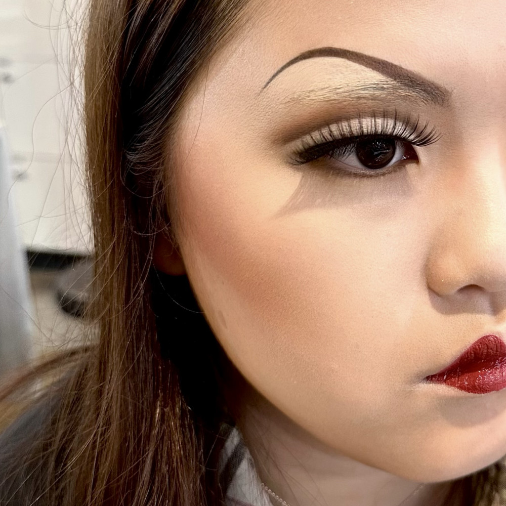 입술은 레드브라운 컬러를 사용해 인커브 형태로 그려주면 완성입니다 ! * 인커브 형태 : 입술산은 둥글고, 입꼬리로 가면서 얇아지는 형태