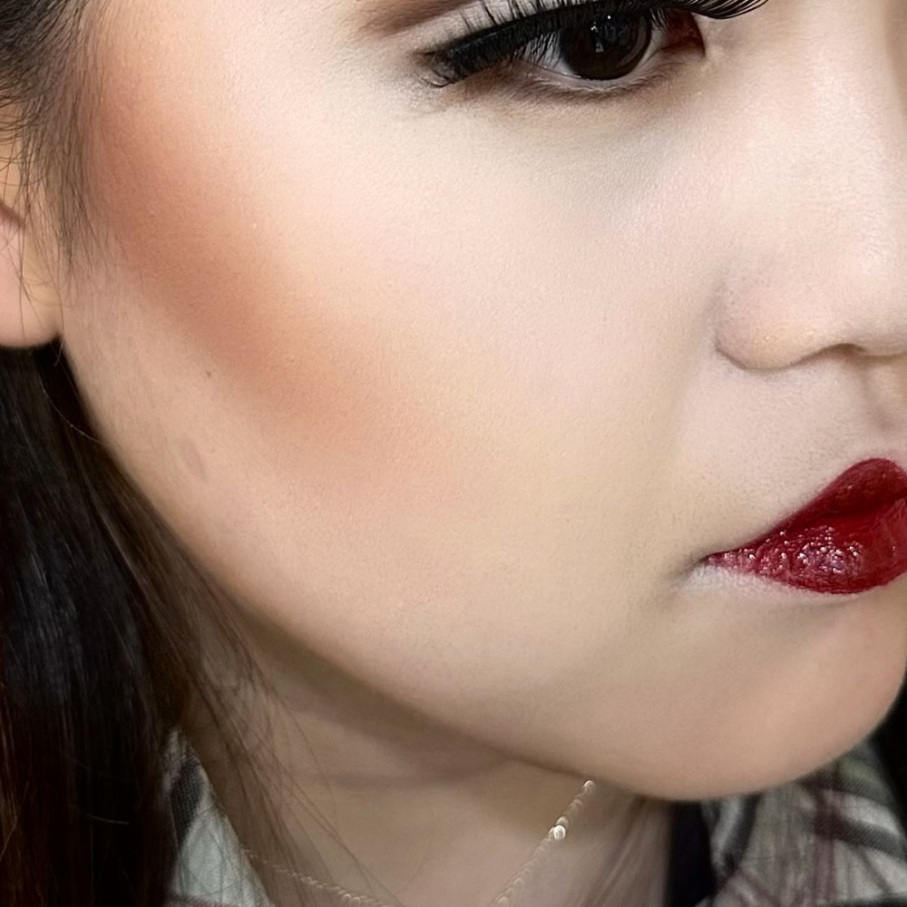 치크는 브라운 색상으로 광대 아래를 따라 쉐이딩해 얼굴에 입체감을 주고, 얼굴 전체에는 핑크 톤을 가볍게 쓸어 자연스러운 생기를 표현했어요.