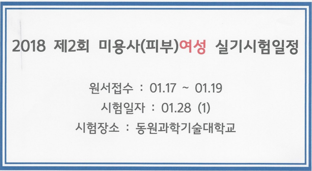 2018년 제 2회 미용사(피부)여성 실기시험일정을 알려드리겠습니다.