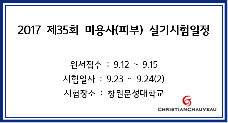 2017 제35회 미용사(피부) 실기시험일정 -창원- 페이지 정보 작성자 크리스챤쇼보 작성일17-09-06 12:11 조회32,777회 댓글0건 관련링크 이전글 다음글 목록 본문 2017 제35회 미용사(피부) 실기시험일정 -창원-원서접수 : 9.12 ~ 9.15시험일자 : 9.23 ~ 9.24(2) 시험장소 : 창원문성대학교창원미용학원 크리스챤쇼보055 261 0080 댓글목록 등록된 댓글이 없습니다. 이전글 다음글 목록