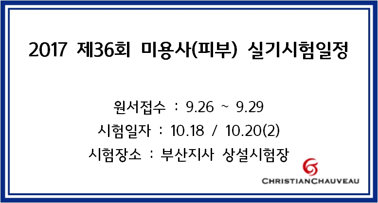 2017 제36회 미용사(피부) 실기시험일정 -부산- 페이지 정보 작성자 크리스챤쇼보 작성일17-09-19 12:05 조회34,247회 댓글0건 관련링크 이전글 다음글 목록 본문 2017 제36회 미용사(피부) 실기시험일정 -부산-원서접수 : 9.26 ~ 9.29시험일자 : 10.18 / 10.20(2)시험장소 : 부산지사 상설시험장창원미용학원 크리스챤쇼보055 261 0080 댓글목록 등록된 댓글이 없습니다. 이전글 다음글 목록