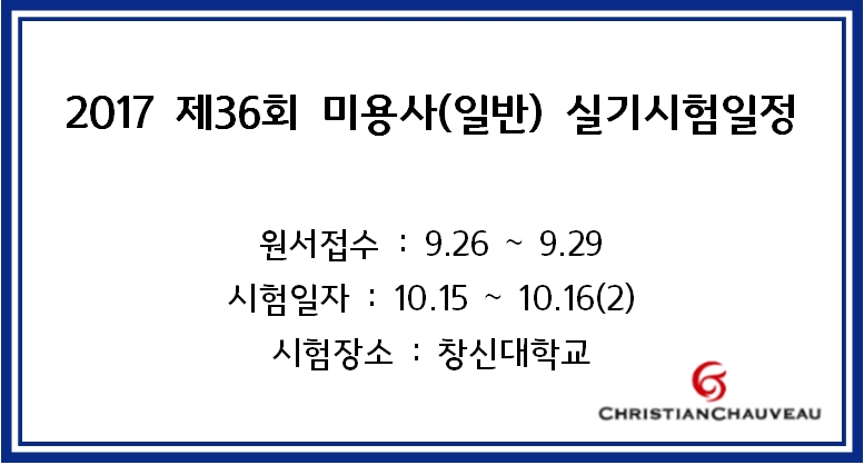 2017 제36회 미용사(일반) 실기시험일정 -창원- 페이지 정보 작성자 크리스챤쇼보 작성일17-09-19 12:08 조회34,703회 댓글0건 관련링크 이전글 다음글 목록 본문 2017 제36회 미용사(일반) 실기시험일정 -창원-원서접수 : 9.26 ~ 9.29시험일자 : 10.15 ~ 10.16(2)시험장소 : 창신대학교창원미용학원 크리스챤쇼보055 261 0080 댓글목록 등록된 댓글이 없습니다. 이전글 다음글 목록