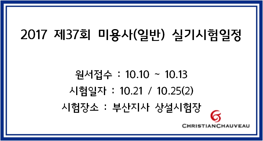 2017 제37회 미용사(일반) 실기시험일정 -부산- 페이지 정보 작성자 크리스챤쇼보 작성일17-09-29 10:18 조회35,327회 댓글0건 관련링크 이전글 다음글 목록 본문 2017 제37회 미용사(일반) 실기시험일정 -부산-원서접수 : 10.10 ~ 10.13시험일자 : 10.21 / 10.25(2)시험장소 : 부산지사 상설시험장창원미용학원 크리스챤쇼보055 261 0080 댓글목록 등록된 댓글이 없습니다. 이전글 다음글 목록