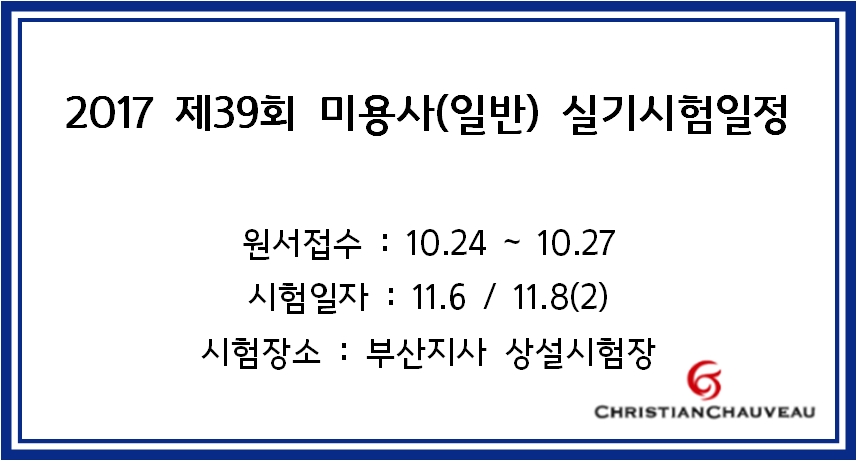 2017 제39회 미용사(일반) 실기시험일정 -부산- 페이지 정보 작성자 크리스챤쇼보 작성일17-10-20 10:22 조회37,957회 댓글0건 관련링크 이전글 다음글 목록 본문 2017 제39회 미용사(일반) 실기시험일정 -부산-원서접수 : 10.24 ~ 10.27시험일자 : 11.6 / 11.8(2)시험장소 : 부산지사 상설시험장창원미용학원 크리스챤쇼보055 261 0080 댓글목록 등록된 댓글이 없습니다. 이전글 다음글 목록