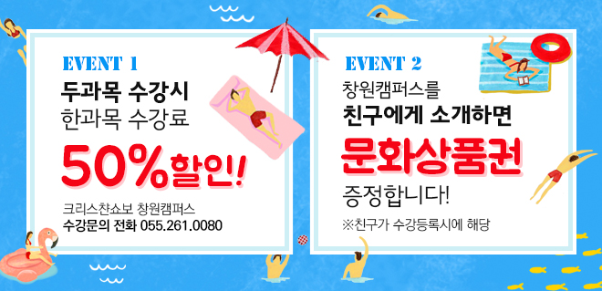 ★8월 이벤트★ 페이지 정보 작성자 크리스챤쇼보 작성일17-08-11 14:50 조회37,202회 댓글0건 관련링크 이전글 다음글 목록 본문 저희 쇼보 8월 이벤트를 알려드립니다!!!!이벤트 1. 두 과목 수강 시 한 과목 수강료 50%↓ 할인!이벤트 2. 소개 시 문화상품권 증정! ※ 조기종료될 수 있으니 어서 서두르세요~!! 자세한 사항은 전화 문의 바랍니다^^* 창원미용학원 크리스챤쇼보 055 261 0080 댓글목록 등록된 댓글이 없습니다. 이전글 다음글 목록