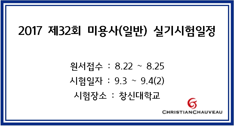 2017 제32회 미용사(일반) 실기시험일정 -창원- 페이지 정보 작성자 크리스챤쇼보 작성일17-08-17 12:00 조회34,348회 댓글0건 관련링크 이전글 다음글 목록 본문 2017 제32회 미용사(일반) 실기시험일정 -창원-원서접수 : 8.22 ~ 8.25(2)시험일자 : 9.3 ~ 9.4(2)시험장소 : 창신대학교창원미용학원 크리스챤쇼보055 261 0080 댓글목록 등록된 댓글이 없습니다. 이전글 다음글 목록
