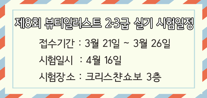 제8회 뷰티일러스트 2·3급 실기 시험일정 페이지 정보 작성자 크리스챤쇼보 작성일16-02-26 15:56 조회28,225회 댓글0건 관련링크 이전글 다음글 목록 본문 제8회 뷰티일러스트 2·3급 실기 시험일정을 알려드립니다.접수기간 : 3월 21일 ~ 3월 26일시험일시 : 4월 16일시험장소 : 크리스챤쇼보 3층창원미용학원크리스챤쇼보055 261 0080 댓글목록 등록된 댓글이 없습니다. 이전글 다음글 목록