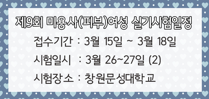 9회차 미용사(피부)여성 실기 시험일정 페이지 정보 작성자 크리스챤쇼보 작성일16-03-16 14:05 조회28,869회 댓글0건 관련링크 이전글 다음글 목록 본문 9회차 미용사(피부)여성 실기 시험일정을 알려드립니다.접수기간 : 3월 15일 ~ 3월 18일시험일시 : 3월 26~27일 (2)시험장소 : 창원문성대학교창원미용학원 크리스챤쇼보055 261 0080 댓글목록 등록된 댓글이 없습니다. 이전글 다음글 목록