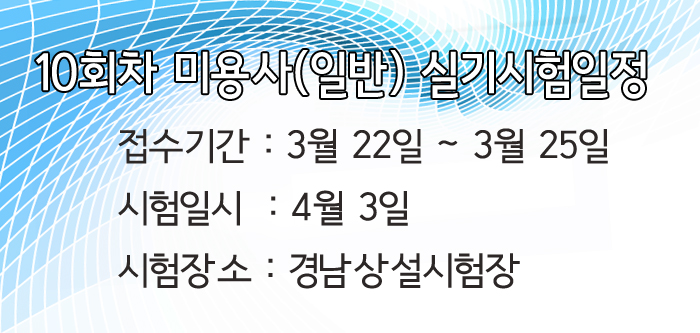 10회차 미용사(일반) 실기 시험일정 페이지 정보 작성자 크리스챤쇼보 작성일16-03-16 14:06 조회29,343회 댓글0건 관련링크 이전글 다음글 목록 본문 10회차 미용사(일반) 실기 시험일정을 알려드립니다.접수기간 : 3월 22일 ~25일시험일시 : 4월 3일시험장소 : 경남상설시험장창원미용학원 크리스챤쇼보055 261 0080 댓글목록 등록된 댓글이 없습니다. 이전글 다음글 목록