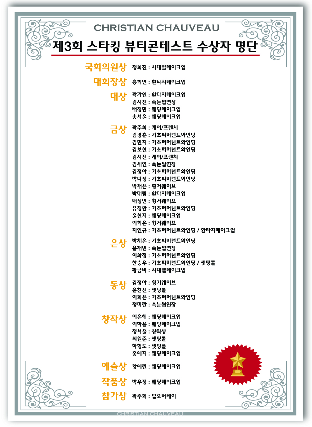 ★ 3회스타킹뷰티콘테스트 수상자명단 ★ 페이지 정보 작성자 크리스챤쇼보 작성일16-05-17 12:15 조회31,308회 댓글0건 관련링크 이전글 다음글 목록 본문 수상하신 쇼보 학생여러분축하드려요!!!창원미용학원 크리스챤쇼보055 261 0080 댓글목록 등록된 댓글이 없습니다. 이전글 다음글 목록