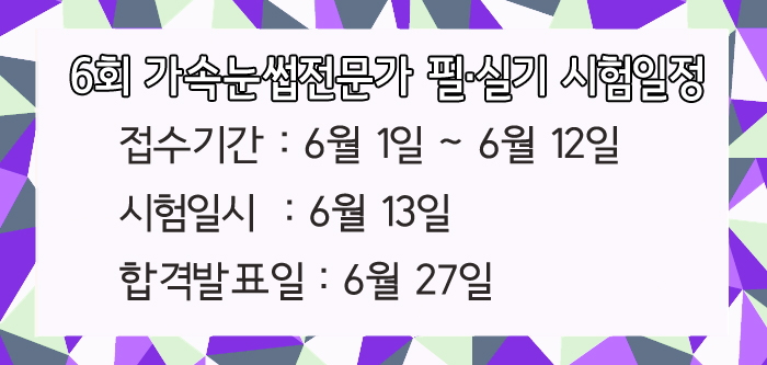 제6회 가속눈썹전문가 필실기 시험일정 페이지 정보 작성자 크리스챤쇼보 작성일16-05-23 14:52 조회32,211회 댓글0건 관련링크 이전글 다음글 목록 본문 제6회 가속눈썹전문가 필실기 시험일정을 알려드립니다.접수기간 : 6월 1일 ~ 6월 12일시험일시 : 6월 13일 합격발표일 : 6월 27일창원미용학원 크리스챤쇼보055 261 0080 댓글목록 등록된 댓글이 없습니다. 이전글 다음글 목록