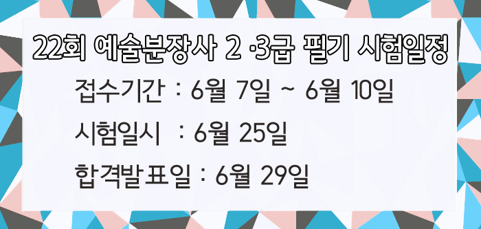 22회 예술분장사 2·3급 필기 시험일정 페이지 정보 작성자 크리스챤쇼보 작성일16-05-23 14:53 조회32,156회 댓글0건 관련링크 이전글 다음글 목록 본문 22회 예술분장사 2·3급 필기 시험일정을 알려드립니다.접수기간 : 6월 7일 ~ 6월 10일시험일시 : 6월 25일 합격발표일 : 6월 29일창원미용학원 크리스챤쇼보055 261 0080 댓글목록 등록된 댓글이 없습니다. 이전글 다음글 목록