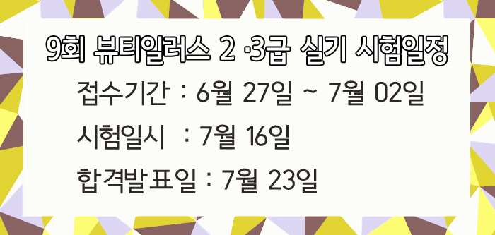 9회 뷰티일러스트 2·3급 실기시험일정 페이지 정보 작성자 크리스챤쇼보 작성일16-05-23 14:55 조회33,575회 댓글0건 관련링크 이전글 다음글 목록 본문 9회 뷰티일러스트 2·3급 실기시험일정을 알려드립니다.접수기간 : 6월 27일 ~ 7월 02일시험일시 : 7월 16일합격발표일 : 7월 23일창원미용학원 크리스챤쇼보055 261 0080 댓글목록 등록된 댓글이 없습니다. 이전글 다음글 목록