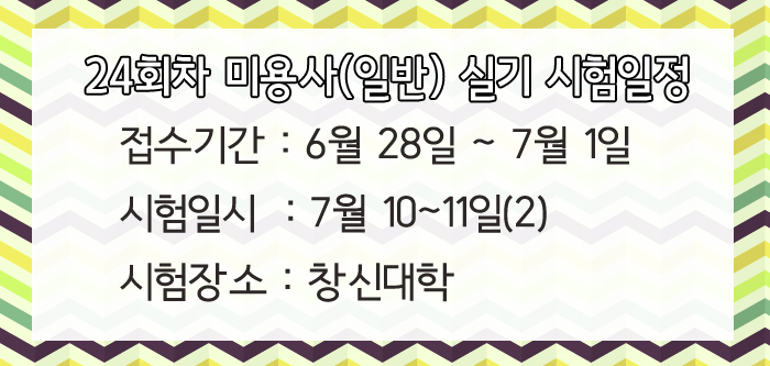 24회차 미용사(일반) 실기시험일정을 알려드립니다. 페이지 정보 작성자 크리스챤쇼보 작성일16-06-23 16:12 조회40,332회 댓글0건 관련링크 이전글 다음글 목록 본문 24회차 미용사(일반) 실기시험일정을 알려드립니다.접수기간 : 6월 28일 ~ 7월 1일시험일시 : 7월 10~11일 (2)시험장소 : 창신대학창원미용학원 크리스챤쇼보055 261 0080 댓글목록 등록된 댓글이 없습니다. 이전글 다음글 목록