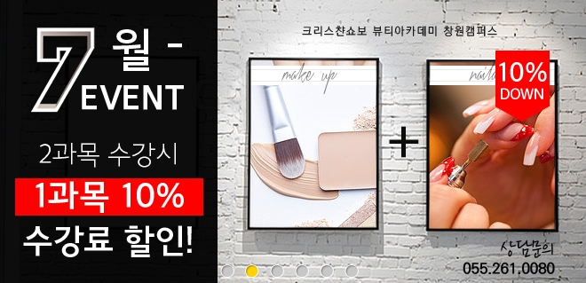 ▶ 7월 이벤트 페이지 정보 작성자 크리스챤쇼보 작성일16-07-05 11:32 조회36,191회 댓글0건 관련링크 이전글 다음글 목록 본문 < 7월 이벤트 >2과목 수강 시1과목 10% 수강료 할인 이벤트창원미용학원 크리스챤쇼보055 261 0080 댓글목록 등록된 댓글이 없습니다. 이전글 다음글 목록