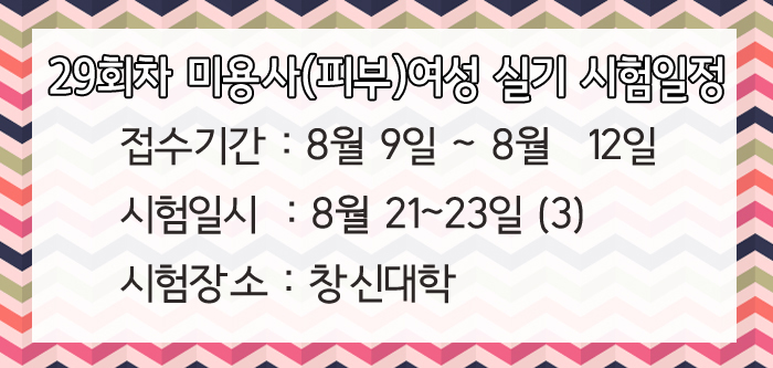 29회차 미용사(피부)여성 실기 시험일정 페이지 정보 작성자 크리스챤쇼보 작성일16-07-13 12:26 조회33,065회 댓글0건 관련링크 이전글 다음글 목록 본문 29회차 미용사(피부)여성 실기 시험일정을 알려드립니다.접수기간 : 8월 9일 ~ 8월 12일시험일시 : 8월 21~23일 (3)시험장소 : 창신대학창원미용학원 크리스챤쇼보055 261 0080 댓글목록 등록된 댓글이 없습니다. 이전글 다음글 목록