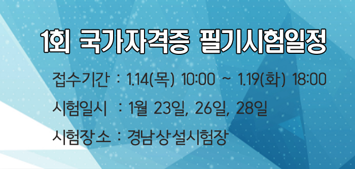 1회 국가자격증 필기시험일정 페이지 정보 작성자 크리스챤쇼보 작성일16-01-14 10:11 조회29,089회 댓글0건 관련링크 이전글 다음글 목록 본문 1회 국가자격증 필기시험일정을 알려드립니다.미용사(일반, 피부)접수기간 : 1월 14일 ~ 1월 19일시험일시 : 1월 23일, 26일, 28일시험장소 : 경남상설시험장창원미용학원 크리스챤쇼보055 261 0080 댓글목록 등록된 댓글이 없습니다. 이전글 다음글 목록