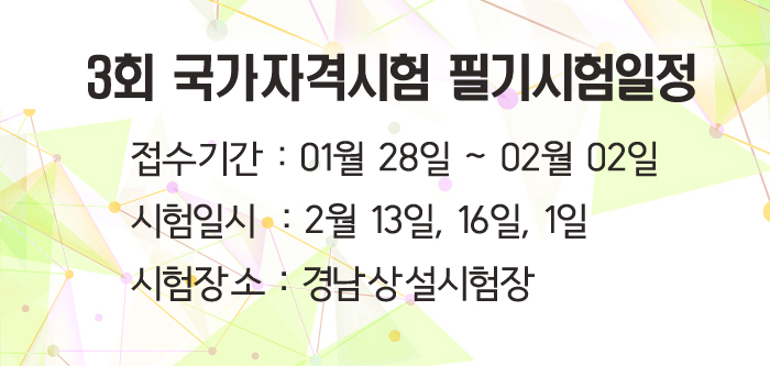 3회 국가자격증 필기시험일정 페이지 정보 작성자 크리스챤쇼보 작성일16-02-02 12:02 조회29,589회 댓글0건 관련링크 이전글 다음글 목록 본문 3회 국가자격증 필기시험일정을 안내드립니다.접수기간 : 1월 28일 ~ 2월 2일시험일시 : 2월 13일, 16일, 18일시험장소 : 경남상설시험장창원미용학원 크리스챤쇼보055 261 0080 댓글목록 등록된 댓글이 없습니다. 이전글 다음글 목록