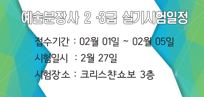 예술분장사 2·3급 실기시험일정 페이지 정보 작성자 크리스챤쇼보 작성일16-02-02 12:04 조회29,697회 댓글0건 관련링크 이전글 다음글 목록 본문 예술분장사 2·3급 실기시험일정을 안내드립니다.접수기간 : 2월 1일 ~ 2월 5일시험일시 : 2월 27일시험장소 : 크리스챤쇼보 3층창원미용학원 크리스챤쇼보055 261 0080 댓글목록 등록된 댓글이 없습니다. 이전글 다음글 목록