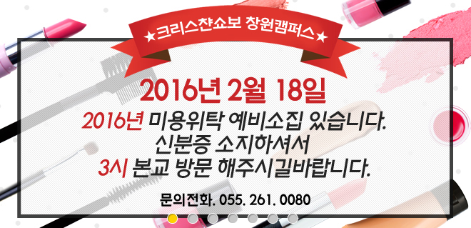 ★ 2016년 미용위탁 예비소집일 안내 ★ 페이지 정보 작성자 크리스챤쇼보 작성일16-02-15 14:27 조회29,730회 댓글0건 관련링크 이전글 다음글 목록 본문 ★ 2016년 미용위탁 예비소집일 안내 ★2월 18일미용위탁교육생 예비소집일이 있습니다!신분증 소지하셔서본교에 3시까지 방문해주시길 바랍니다.창원미용학원 크리스챤쇼보055 261 0080 댓글목록 등록된 댓글이 없습니다. 이전글 다음글 목록