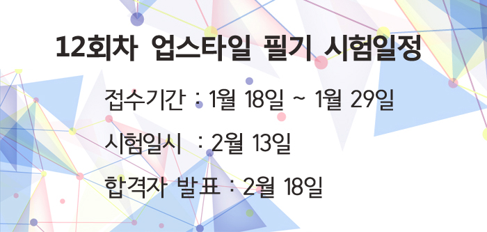 12회차 업스타일 필기시험일정 페이지 정보 작성자 크리스챤쇼보 작성일16-01-07 10:03 조회30,297회 댓글0건 관련링크 이전글 다음글 목록 본문 12회차 업스타일 필기시험일정을 안내드립니다.접수기간 : 1월 18일~ 1월 29일시험일시 : 2월 13일합격자 발표 : 2월 18일준비하셔서 시험을 치를 수 있도록해요~!!창원미용학원 크리스챤쇼보055 261 0080 댓글목록 등록된 댓글이 없습니다. 이전글 다음글 목록