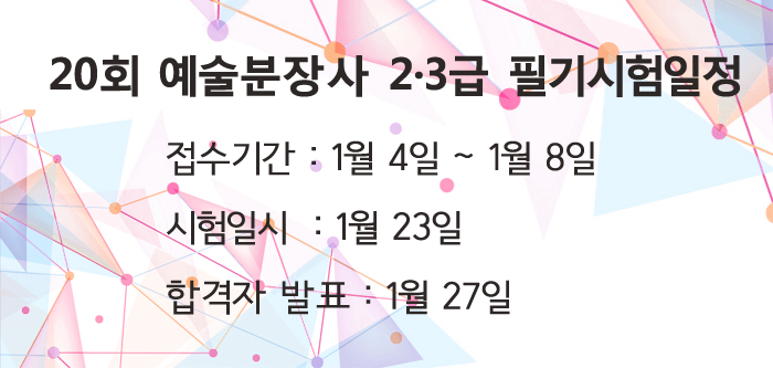 20회차 예술분장사 2·3급 필기시험일정 페이지 정보 작성자 크리스챤쇼보 작성일16-01-07 10:06 조회29,976회 댓글0건 관련링크 이전글 다음글 목록 본문 20회차 예술분장사 2·3급 필기시험일정안내드립니다.접수기간 : 1월 4일~ 1월 8일시험일시 : 1월 23일합격자 발표 : 1월 27일자격증 취득을 위해 화이팅!!창원미용학원 크리스챤쇼보055 261 0080 댓글목록 등록된 댓글이 없습니다. 이전글 다음글 목록