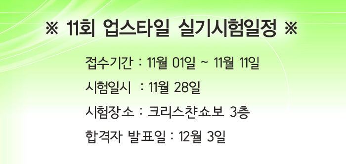 11회 업스타일 실기시험일정 페이지 정보 작성자 크리스챤쇼보 작성일15-10-26 14:42 조회36,326회 댓글0건 관련링크 이전글 다음글 목록 본문 ★업스타일 실기시험일정 공지사항★ 접수기간 : 11월 1일~ 11월 11일 자격검정일 : 11월 28일 장소 : 크리스챤 쇼보 3층 강의실 합격자 발표일 : 12월 3일 좋은결과 있기를 쇼보에서 응원합니다.^^창원미용학원 크리스챤쇼보055 261 0080 댓글목록 등록된 댓글이 없습니다. 이전글 다음글 목록