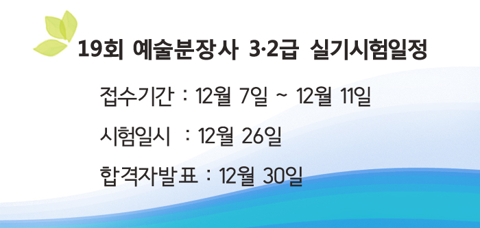 19회 예술분장사 3·2급 실기시험일정 안내 페이지 정보 작성자 크리스챤쇼보 작성일15-12-07 12:01 조회31,281회 댓글0건 관련링크 이전글 다음글 목록 본문 ★예술분장사 실기일정 공지사항★ 접수기간 : 12월 7일~ 12월 11일자격검정일 : 12월 26일합격자 발표일 : 12월 30일 좋은결과 있기를 쇼보에서 응원합니다.^^ 창원미용학원 크리스챤쇼보055 261 0080 댓글목록 등록된 댓글이 없습니다. 이전글 다음글 목록
