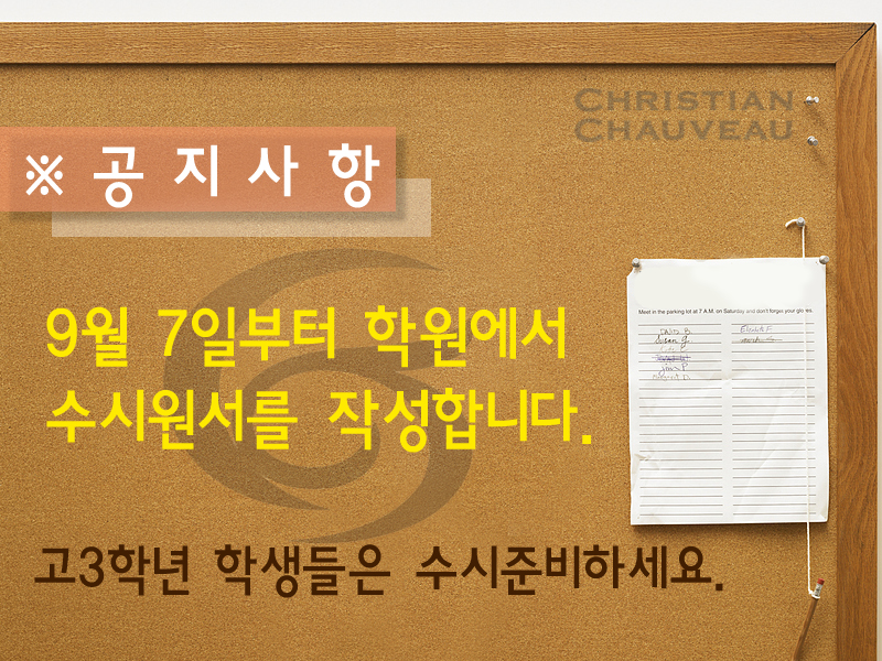 ★9월7일 수시원서 작성 공지사항★ 페이지 정보 작성자 크리스챤쇼보 작성일15-09-04 11:47 조회36,681회 댓글0건 관련링크 이전글 다음글 목록 본문 ★ 공지사항★ 9월 7일부터 학원에서수시원서를 작성합니다. 고3학년 학생들은 수시 준비하세요.☆ 시험에 관해 궁금하신 내용은 아래의 번호로 전화주세요 ☆창원미용학원 크리스챤쇼보055 261 0080 댓글목록 등록된 댓글이 없습니다. 이전글 다음글 목록