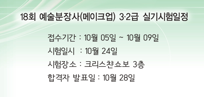 18회 메이크업 3,2급 실기시험일정 페이지 정보 작성자 크리스챤쇼보 작성일15-09-29 15:13 조회33,149회 댓글0건 관련링크 이전글 다음글 목록 본문 ★메이크업시험일정 공지사항★ 접수기간 : 10월 05일 ~ 10월 09일 시험일시 : 10월 24일 시험장소 : 크리스챤 쇼보 3층 강의실 합격자 발표일 : 10월 28일 좋은결과 있기를 쇼보에서 응원합니다.^^창원미용학원 크리스챤쇼보 055 261 0080 댓글목록 등록된 댓글이 없습니다. 이전글 다음글 목록