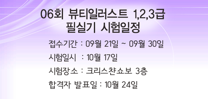 06회 뷰티일러스트 1,2,3급 필실기시험일정 페이지 정보 작성자 크리스챤쇼보 작성일15-09-29 15:16 조회33,391회 댓글0건 관련링크 이전글 다음글 목록 본문 ★뷰티일러스트시험일정 공지사항★ 접수기간 : 09월 21일~ 09월 30일 자격검정일 : 10월 17일 장소 : 크리스챤 쇼보 3층 강의실 합격자 발표일 : 10월 24일 좋은결과 있기를 쇼보에서 응원합니다.^^창원미용학원 크리스챤쇼보055 261 0080 댓글목록 등록된 댓글이 없습니다. 이전글 다음글 목록