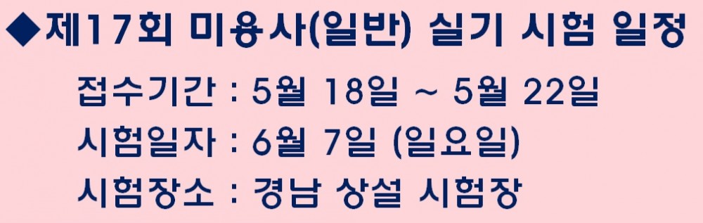★2015년도 제17회 미용사(헤어) 실기 시험일정★ 페이지 정보 작성자 크리스챤쇼보 작성일15-05-14 15:43 조회38,767회 댓글0건 관련링크 이전글 다음글 목록 본문 -크리스챤쇼보-★2015년도 제17회 미용사(헤어) 실기 시험일정★ 접수기간 : 2015. 05. 18 ~ 05. 22시험일자 : 2015. 06. 07 (일요일) 시험장소 : 경남 상설 시험장창원미용학원 크리스챤쇼보055 261 0080 댓글목록 등록된 댓글이 없습니다. 이전글 다음글 목록