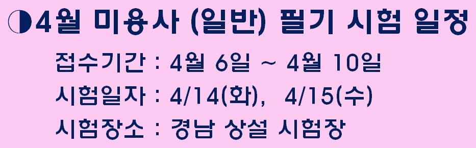 ★2015년도 4월 미용사(헤어) 필기 시험일정3★ 페이지 정보 작성자 크리스챤쇼보 작성일15-04-07 10:16 조회32,712회 댓글0건 관련링크 이전글 다음글 목록 본문 -크리스챤쇼보-★2015년도 4월 미용사(헤어) 필기 시험일정3★ 접수기간 : 2015. 04. 06 ~ 04. 10시험일자 : 04/14(화), 04/15(수) 시험장소 : 경남 상설 시험장창원미용학원 크리스챤쇼보055 261 0080 댓글목록 등록된 댓글이 없습니다. 이전글 다음글 목록