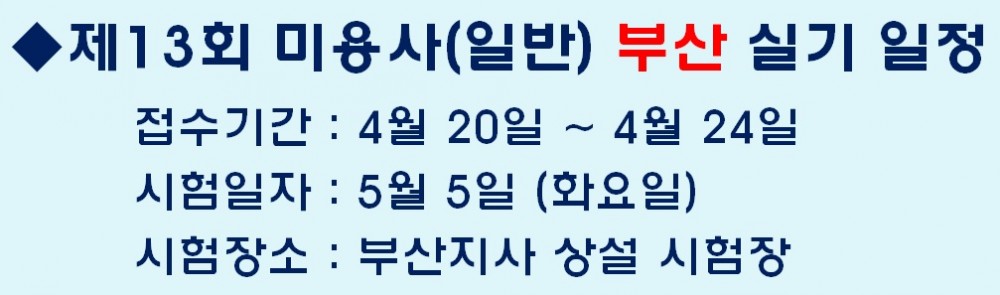 ★2015년도 제13회 미용사(헤어) 부산 실기 시험 일정★ 페이지 정보 작성자 크리스챤쇼보 작성일15-04-13 12:09 조회33,557회 댓글0건 관련링크 이전글 다음글 목록 본문 -크리스챤쇼보-★제13회 미용사(헤어) 부산 실기 시험 일정★ 접수기간 : 2015. 04. 20 ~ 04. 24 시험일자 : 05/05 (화요일) 시험장소 : 부산지사 상설 시험장창원미용학원 크리스챤쇼보055 261 0080 댓글목록 등록된 댓글이 없습니다. 이전글 다음글 목록