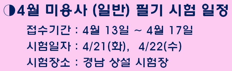 ★2015년도 4월 미용사(헤어) 필기 시험일정4★ 페이지 정보 작성자 크리스챤쇼보 작성일15-04-15 11:04 조회35,334회 댓글0건 관련링크 이전글 다음글 목록 본문 -크리스챤쇼보-★2015년도 4월 미용사(헤어) 필기 시험일정4★ 접수기간 : 2015. 04. 13 ~ 04. 17시험일자 : 04/21(화), 04/22(수) 시험장소 : 경남 상설 시험장창원미용학원 크리스챤쇼보055 261 0080 댓글목록 등록된 댓글이 없습니다. 이전글 다음글 목록