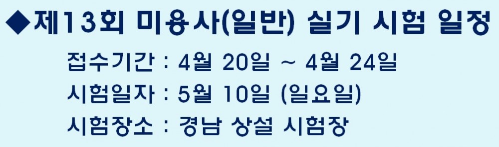 ★2015년도 제13회 미용사(헤어) 실기 시험 일정★ 페이지 정보 작성자 크리스챤쇼보 작성일15-04-16 13:54 조회37,858회 댓글0건 관련링크 이전글 다음글 목록 본문 -크리스챤쇼보-★2015년도 제13회 미용사(헤어) 실기 시험 일정★ 접수기간 : 2015. 04. 20 ~ 04. 24시험일자 : 5월 10일 (일요일) 시험장소 : 경남 상설 시험장창원미용학원 크리스챤쇼보055 261 0080 댓글목록 등록된 댓글이 없습니다. 이전글 다음글 목록