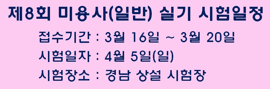 ★2015년도 제8회 미용사(헤어) 경남 실기시험일정★ 페이지 정보 작성자 크리스챤쇼보 작성일15-03-12 11:50 조회35,497회 댓글0건 관련링크 이전글 다음글 목록 본문 -크리스챤쇼보-★2015년도 제8회 미용사(헤어) 실기 시험일정★ 접수기간 : 2015. 03. 16 ~ 03. 20시험일자 : 2015. 04. 05(일) 시험장소 : 경남 상설 시험장창원미용학원 크리스챤쇼보055 261 0080 댓글목록 등록된 댓글이 없습니다. 이전글 다음글 목록