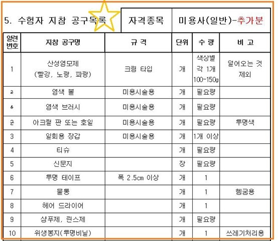 미용사(일반) 수험자 지참 공구목록 추가분입니다.