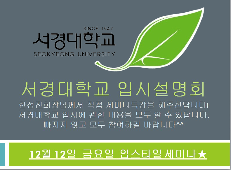 서경대학교 입시설명회★ 페이지 정보 작성자 크리스챤쇼보 작성일14-12-03 11:22 조회32,515회 댓글0건 관련링크 이전글 다음글 목록 본문 -크리스챤쇼보-서경대학교 입시설명회서경대학교 입시설명회!! 한성진회장님꼐서 직접 세미나특강을 해주신답니다.서경대학교 입시에 관한 내용을 모두 알 수 있답니다 ㅎㅎ빠지지 않고 모두 참여하길바랍니다 ㅎㅎ 12월 12일 금요일 업스타일세미나 댓글목록 등록된 댓글이 없습니다. 이전글 다음글 목록