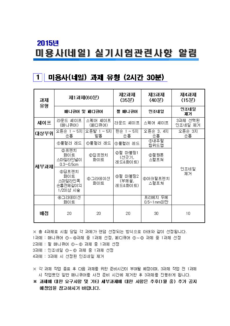 1과제 : 매니큐어 ①~④과제 중 1과제 선정, 페디큐어 ①~③과제 중 1과제 선정