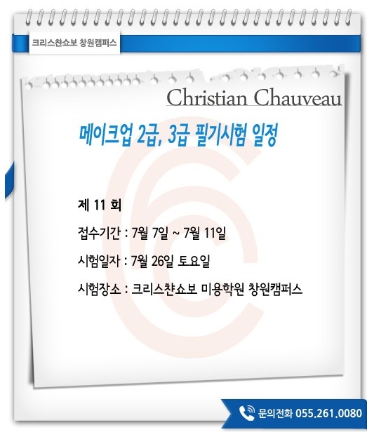 2014년 7월 미용시험일정 - 메이크업 2급,3급 필기시험 일정 페이지 정보 작성자 크리스챤쇼보 작성일14-07-11 12:28 조회31,072회 댓글0건 관련링크 이전글 다음글 목록 본문 - 크리스챤쇼보 - 2014년 7월 미용시험일정 메이크업 2급, 3급 필기시험 일정 제 11 회 접수기간 : 7월 7일 ~ 7월 11일 시험일자 : 7월 26일 토요일 크리스챤쇼보 뷰티아카데미 창원캠퍼스 055 - 261 - 0080 댓글목록 등록된 댓글이 없습니다. 이전글 다음글 목록