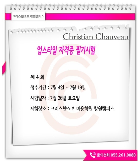 2014년 7월 미용시험일정 - 업스타일 전문가 필기시험 일정 페이지 정보 작성자 크리스챤쇼보 작성일14-07-11 12:30 조회30,766회 댓글0건 관련링크 이전글 다음글 목록 본문 - 크리스챤쇼보 - 2014년 7월 미용시험일정 업스타일 전문가 필기시험 일정 제 4 회 접수기간 : 7월 4일 ~ 7월 19일 시험일자 : 7월 26일 토요일 크리스챤쇼보 뷰티아카데미 창원캠퍼스 055 - 261 - 0080 댓글목록 등록된 댓글이 없습니다. 이전글 다음글 목록